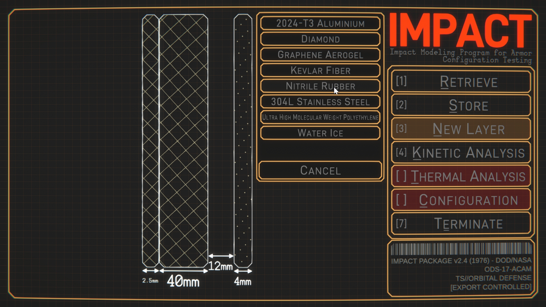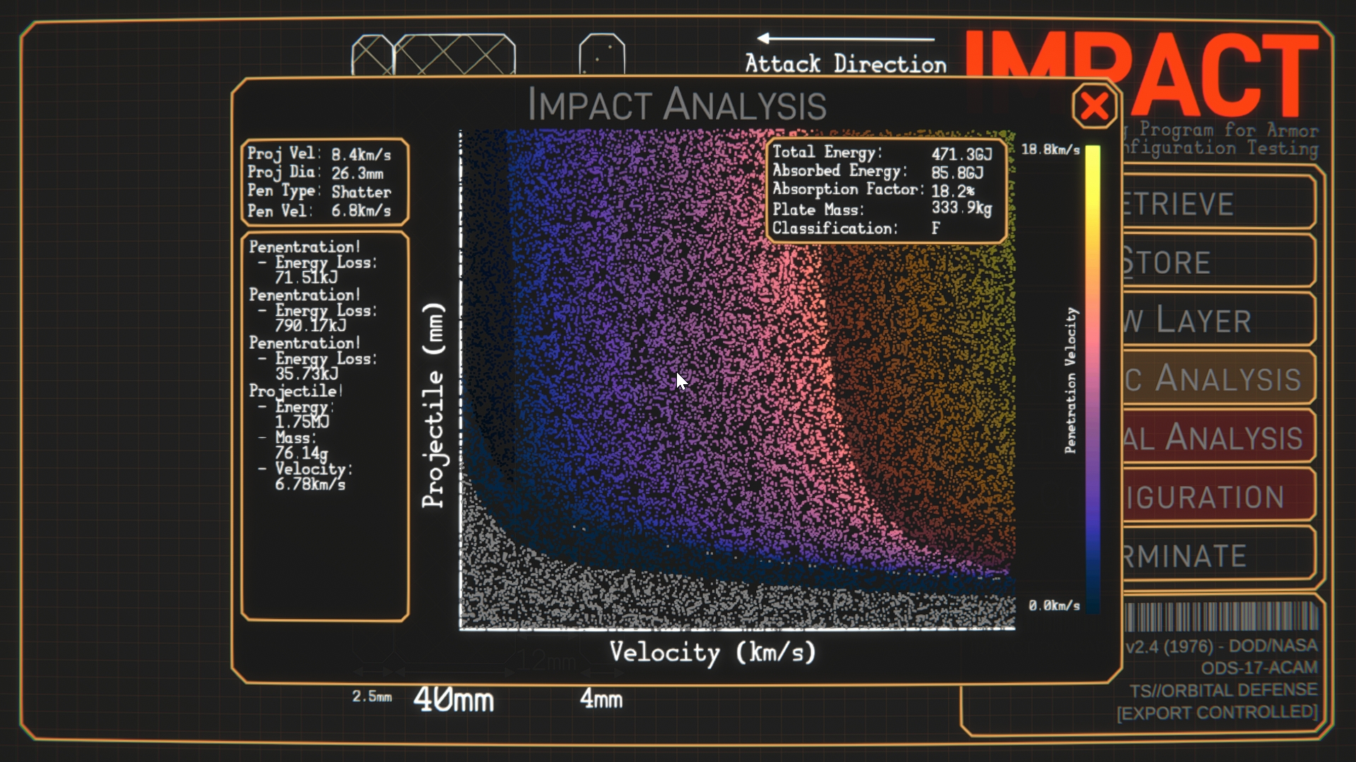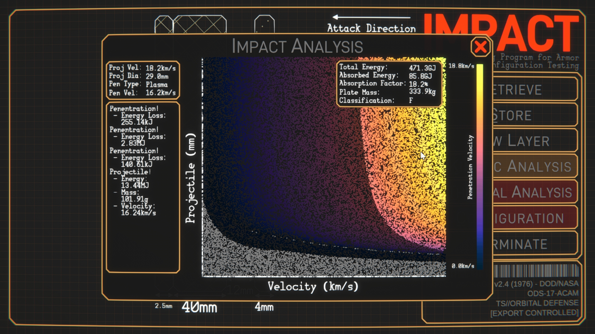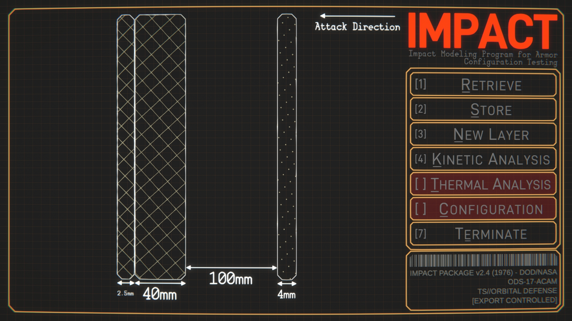 IMPACT (Impact Modelling Program for Armor Configuration Testing) is a spacecraft armour design and test program, styled as an alt-history 1970’s joint DoD/NASA program to develop armour for orbital warships. the game is available to download for free here. Join us on Discord to show off your designs!